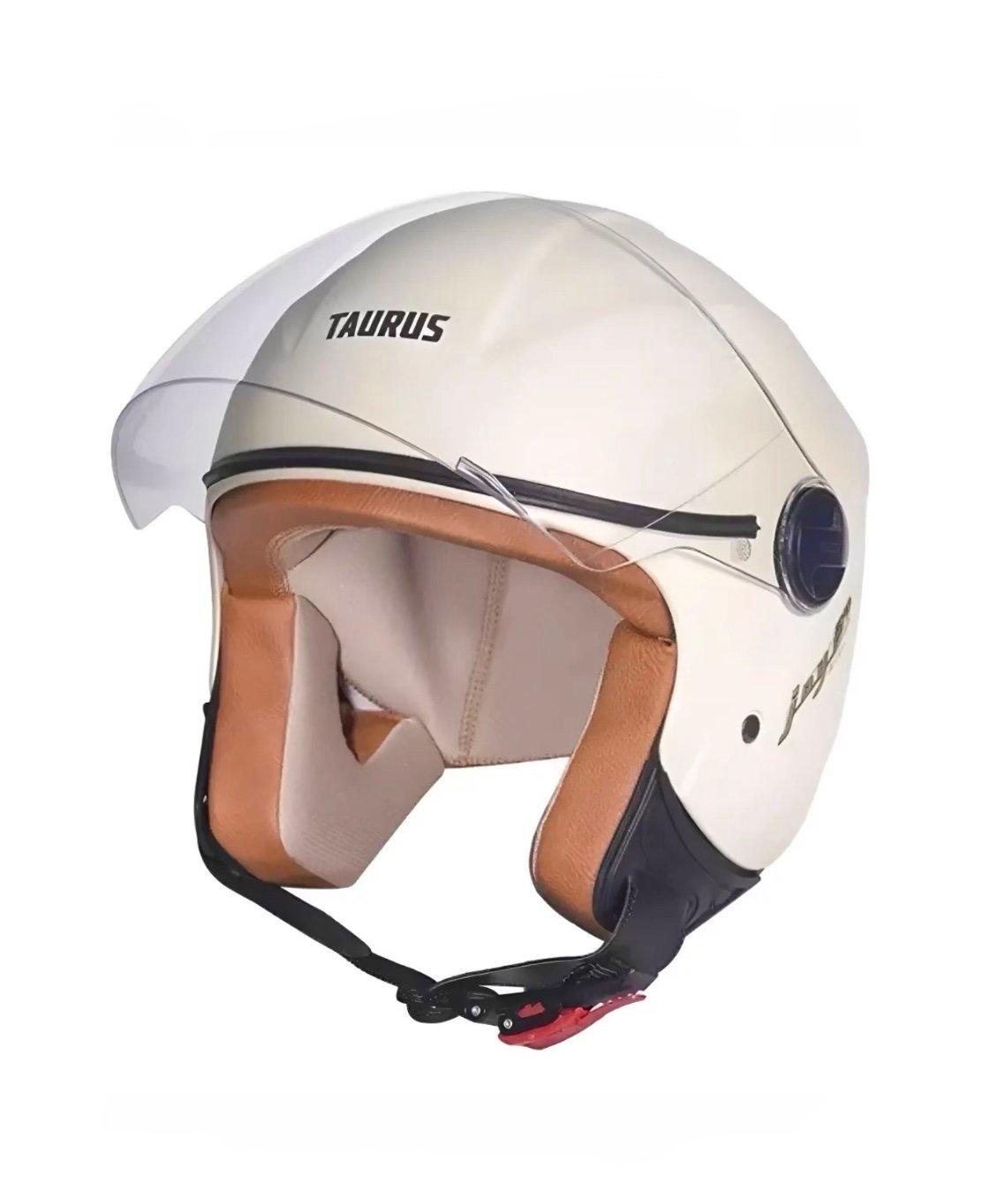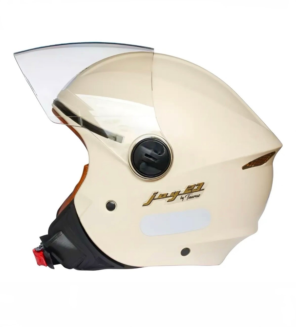 Capacete aberto, na cor bege. Leve, seguro e confortável.