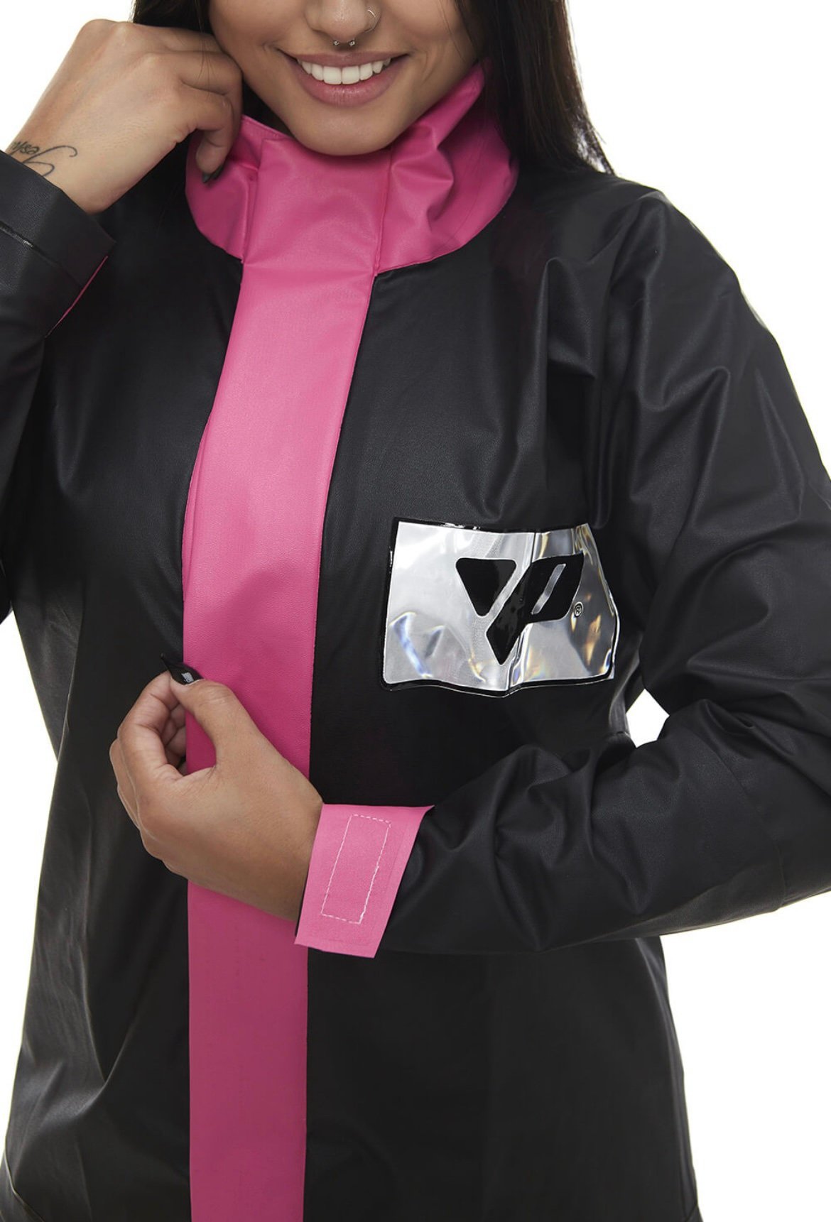 Jaqueta com refletivo peito e costas, elástico na cintura e punho com fechamento em velcro. Calça com fechamento em velcro.